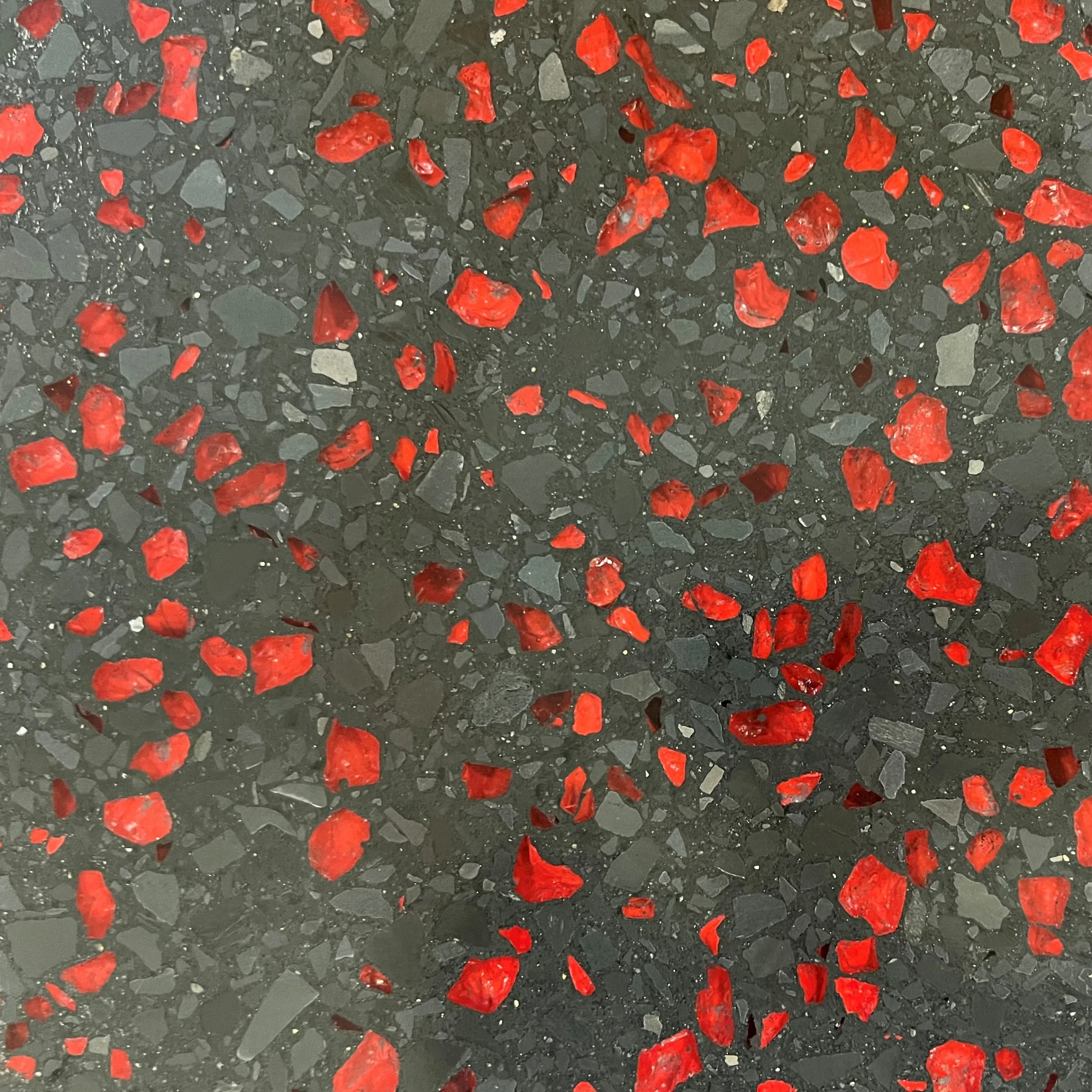 • Rezeptur: 25kg doppo Ambiente Boden, 30kg Marmorsplitt Mischung G1264, 8kg Glasgranulat signalrot 5-10mm, 0,8kg doppo Farbpulver G1264