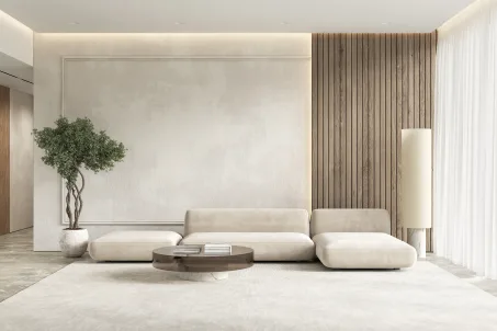 Bild von Front Ansicht eines Wohnzimmers, Spachteltechnik, Holzverkleidung und einer Couch